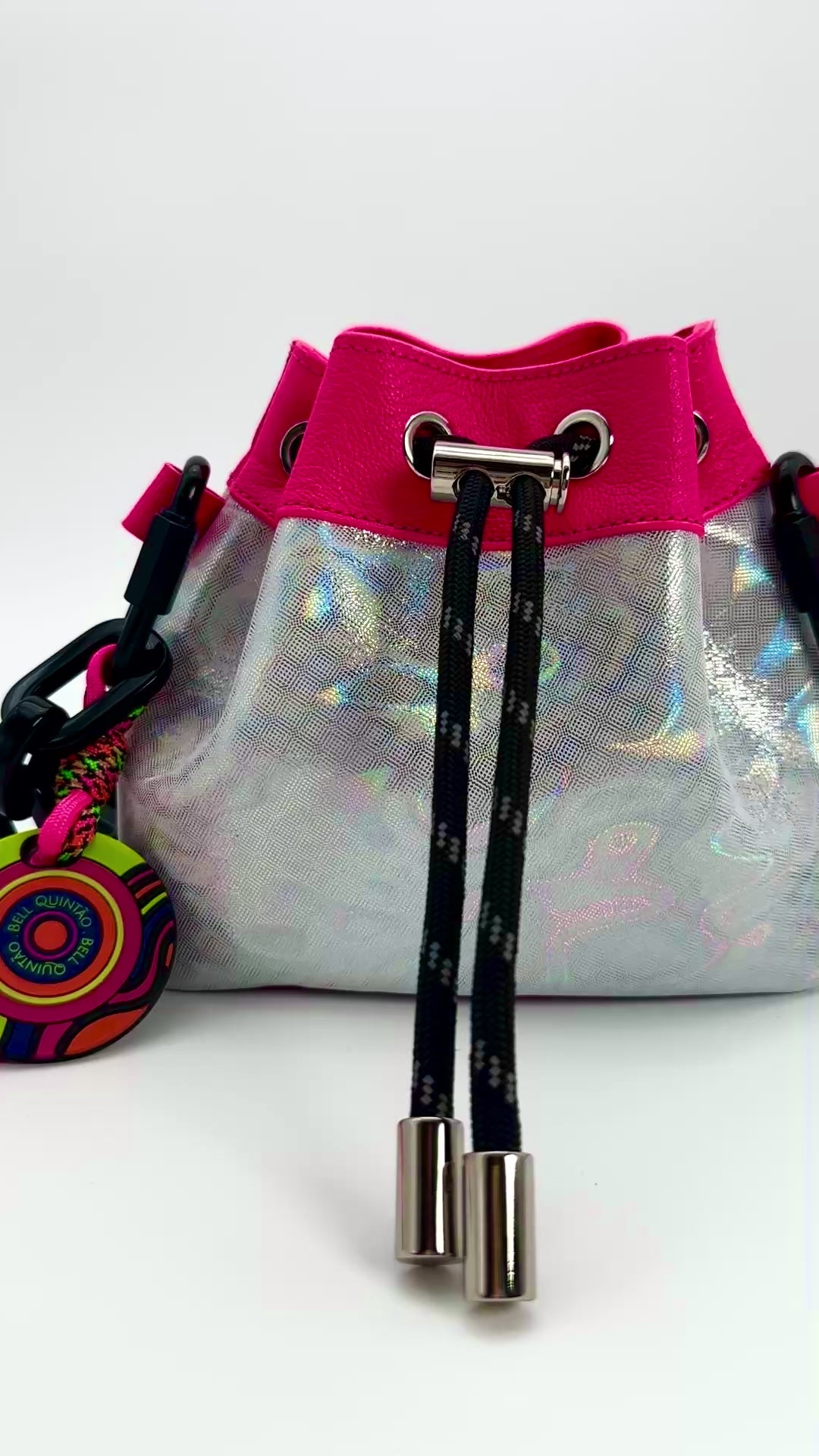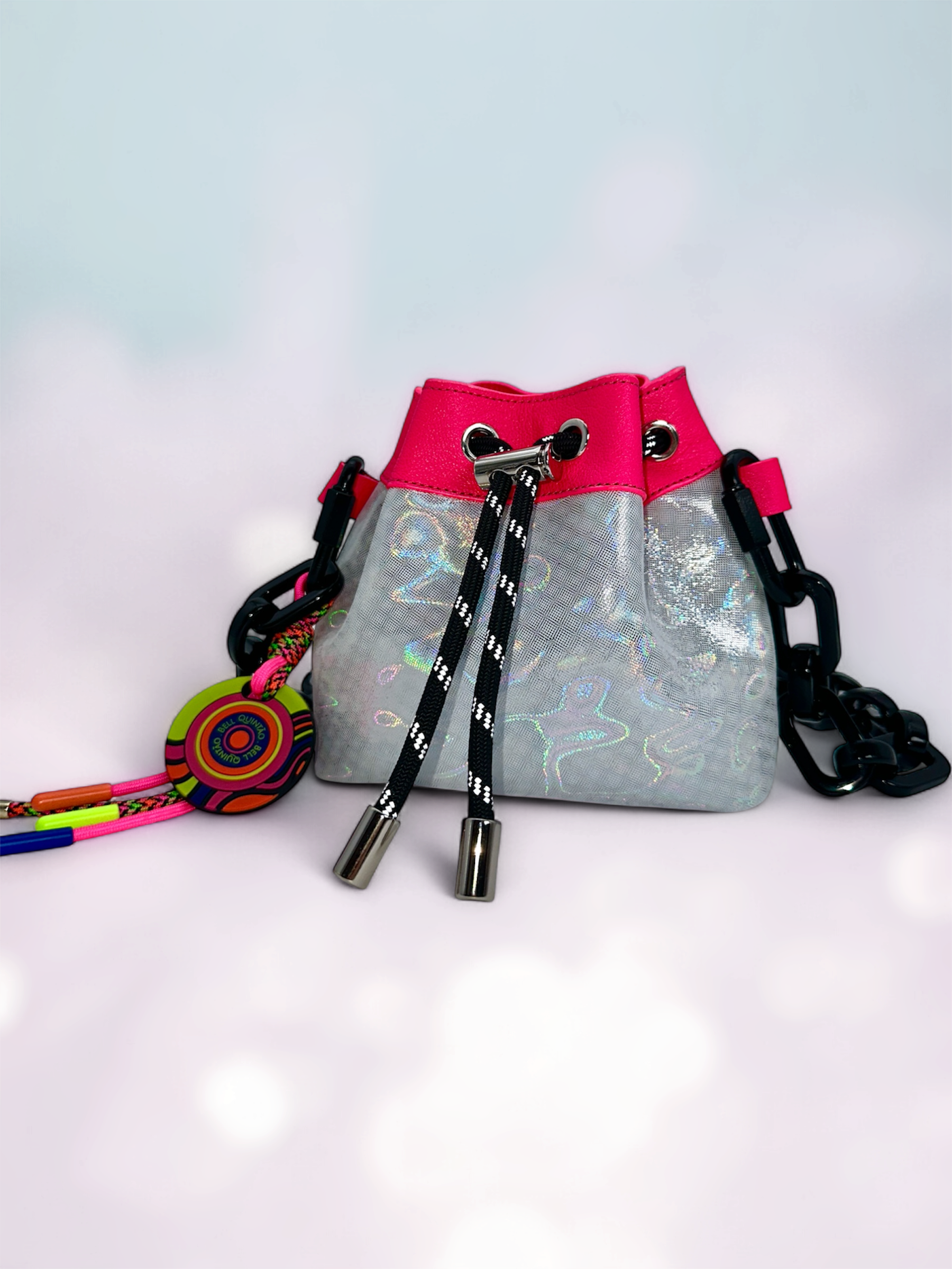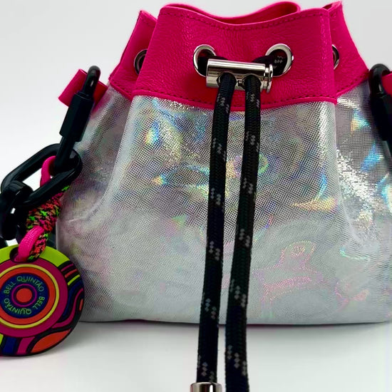 This colorful mini bucket bag is a sensory delight, handcrafted with high quality materials to create a playful mix of colors and textures. Made from premium leather recovered from the luxury industry, materials that would otherwise go to waste. And finished with a custom chain strap crafted from 100% recycled plexiglass, the Giggle Mini Bag embodies joyful design with a sustainable soul. Carry your essentials while adding a pop of joy to your outfit. Embrace the burst of dopamine with the Giggle Mini Bag, a reflection of life's colorful moments.